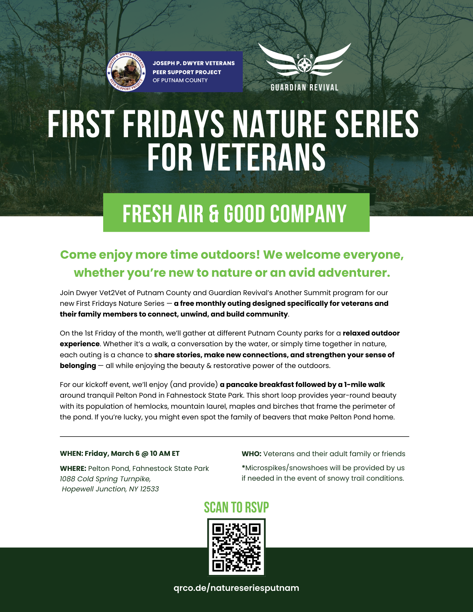 Join Dwyer Vet2Vet of Putnam County and Guardian Revival’s Another Summit program for our new Putnam Nature Series — a free monthly outing designed specifically for veterans and their family members to connect, unwind, and build community.